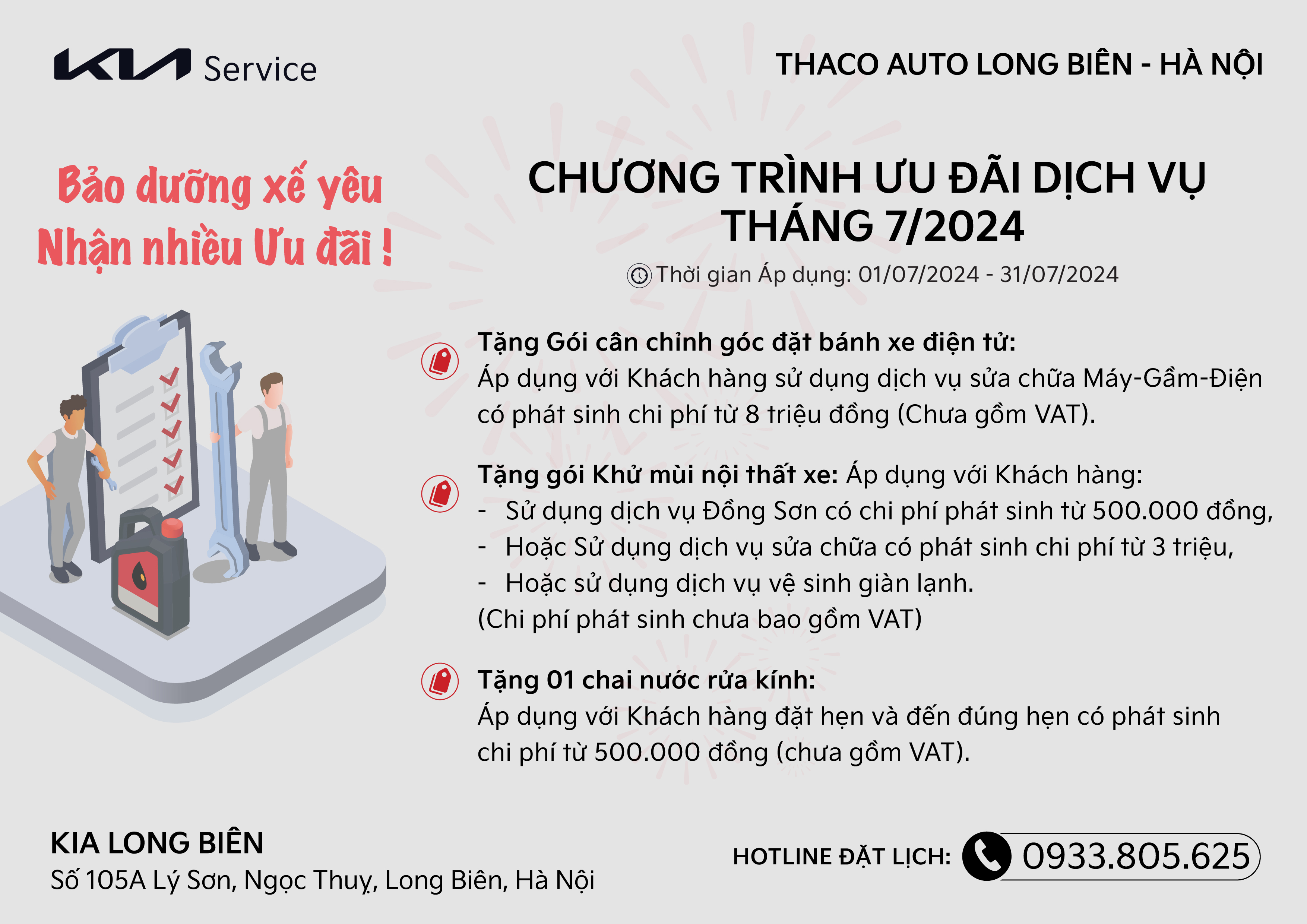 Nhằm gửi đến khách hàng thân thiết của Kia Long Biên những ưu đãi thiết thực, từ ngày 07/06/2024 đến hết ngày 30/06/2024, Xưởng Dịch vụ Kia Long Biên triển khai Chương trình Ưu đãi Dịch vụ dành tặng cho tất cả Quý Khách hàng đến sử dụng dịch vụ sữa chữa và bảo dưỡng xe tại địa chỉ số 105A đường Lý Sơn, Ngọc Thuỵ, Long Biên, Hà Nội.
