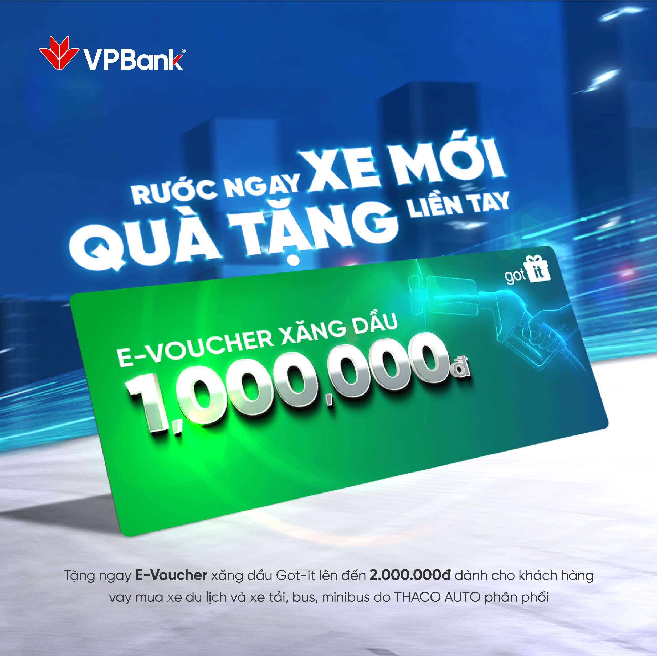 Từ nay đến hết ngày 31/01/2022, khi khách hàng cá nhân vay mua xe ô tô tại Showroom Kia Long Biên và được phê duyệt, giải ngân thành công qua VPBank sẽ được tặng ngay E-Voucher xăng dầu Got-it.